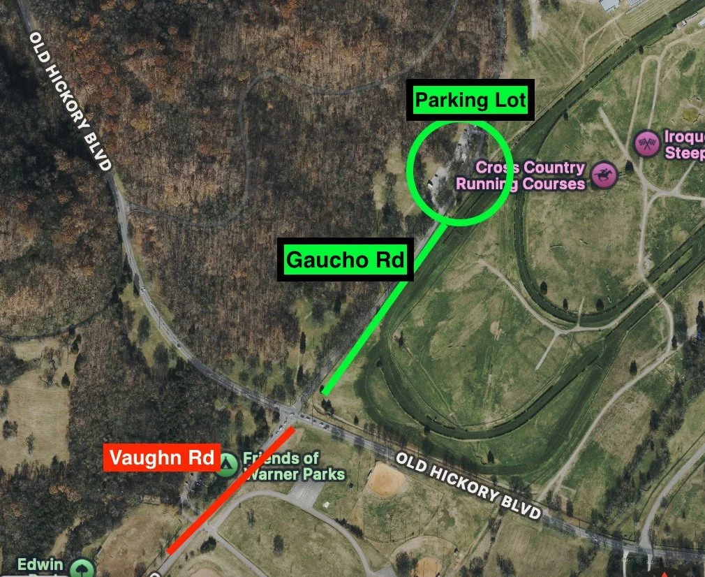 To get to the Gaucho Road Parking Lot in Percy Warner Park: