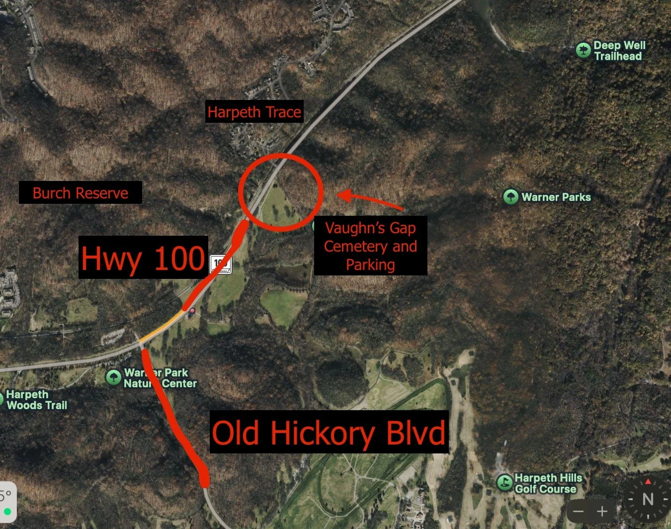 The Vaughn’s Gap Cemetery is on Highway 100, at the intersection with Harpeth Trace Drive. There is a traffic light and crosswalk.